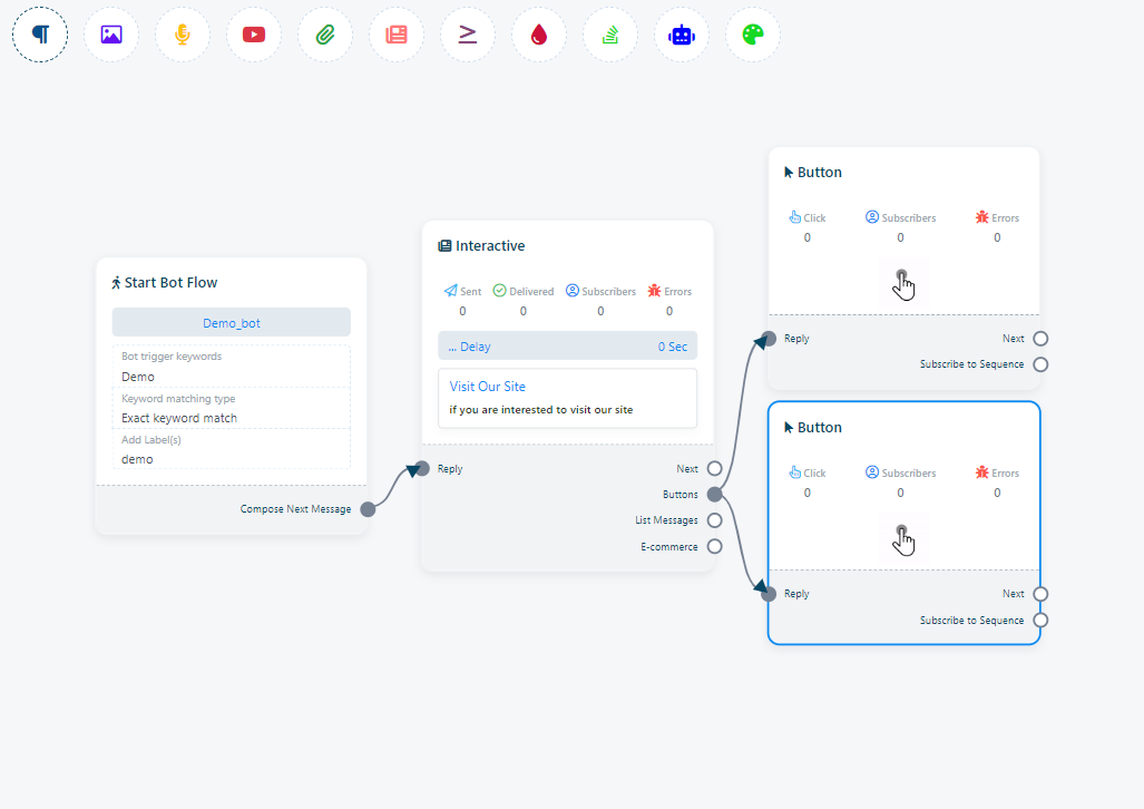 - After setting up the time on the component, the message components that would be sent should be connected to it. These components could include text replies, image replies, audio, or interactive components with buttons, similar to the process of creating a bot reply.